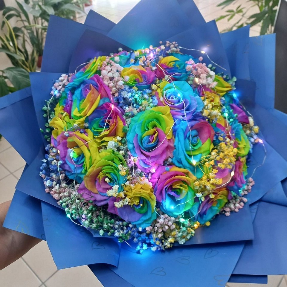 Maxi Bouquet con rose Rainbow prima scelta, gipsophila rainbow e luci!!! Stupiscila/o con questo magnifico bouquet colorato e luminoso!!!